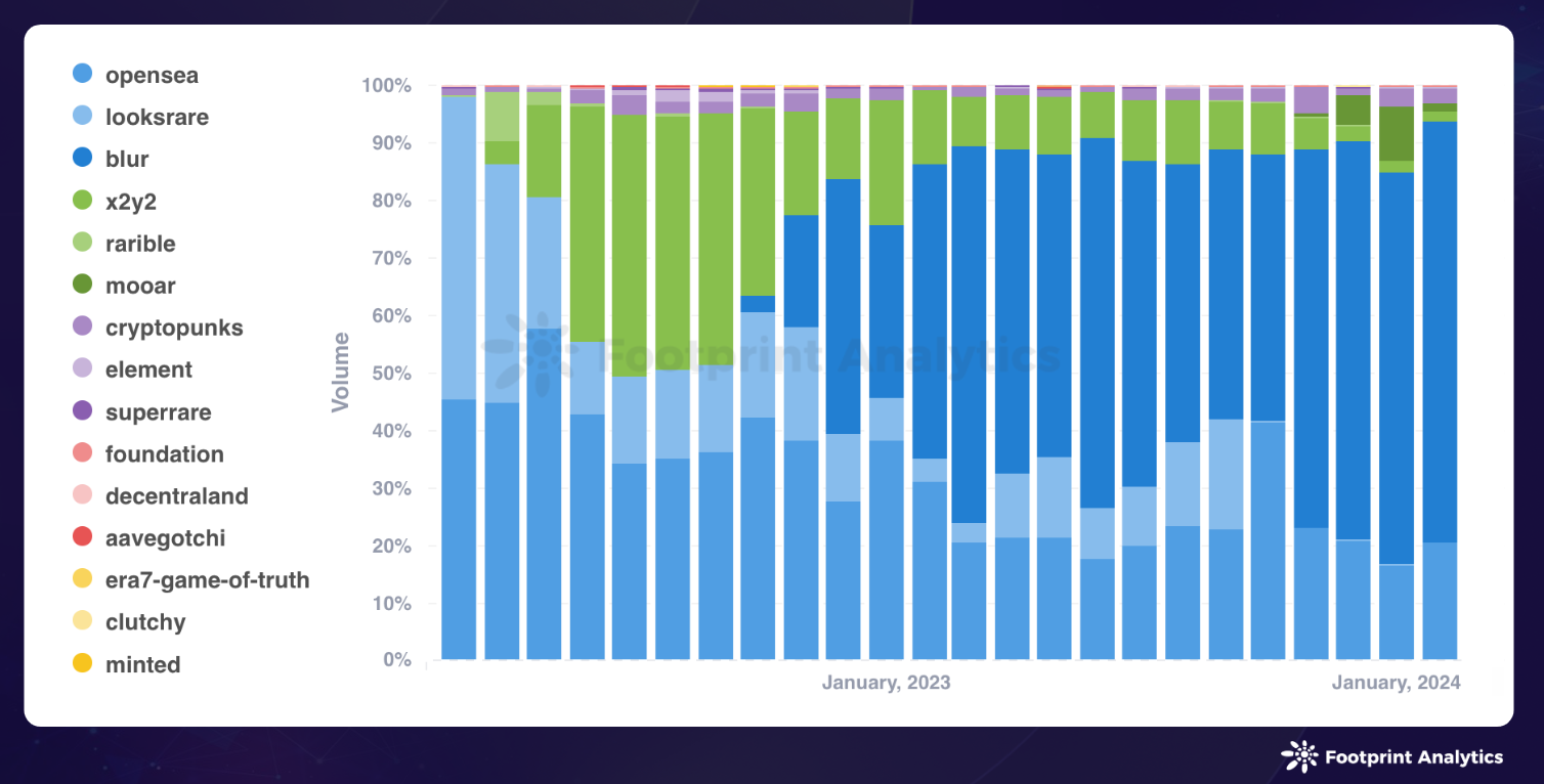 数据来源: NFT 交易市场月交易量占比 - Footprint Analytics