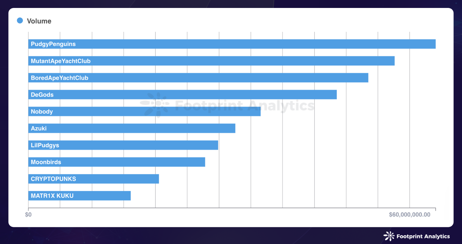 第八名是 Moonbirds ,其交易量为 2,780 万美元。值得一提的是,Yuga Labs 在 2 月 16 日宣布收购了包括 Moonbirds 和其他资产在内的 PROOF,此举迅速推高了 Moonbirds 的地板价和交易量。