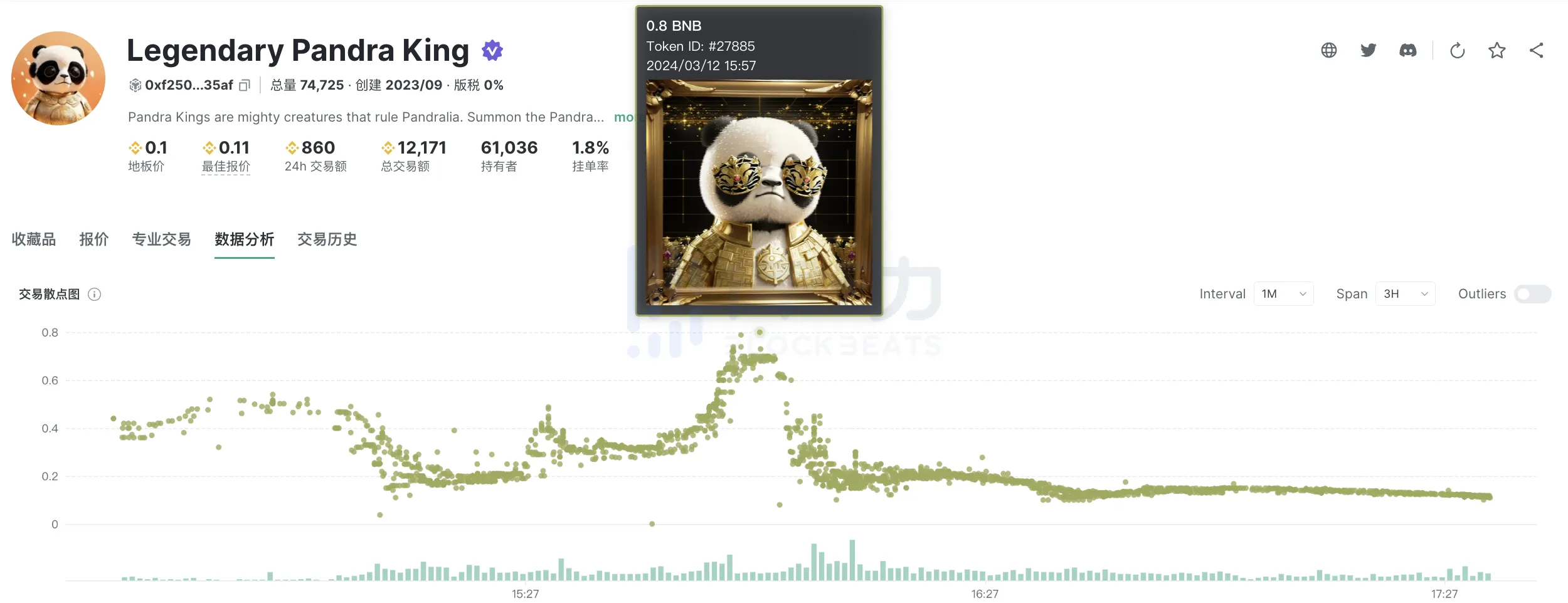 截至撰稿时,Pandra King 的地板价在 0.1 BNB 附近,如果没有新的消息刺激,可能难以再回高位了。