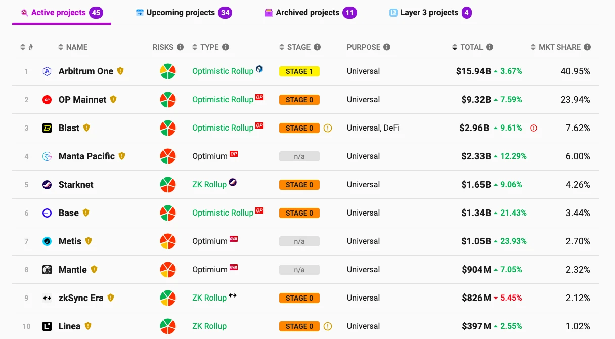 首先, Dencun 升级自然会直接利好整个 Layer 2 板块。 L2 BEAT 数据显示,当前处于运行状态的 Layer 2 数量高达 45 条,待上线主网的 Layer 2 数量亦有 34 条,这其中包含了我们已相当熟悉的 Optimism(OP)、Arbitrum(ARB)、Starknet(STRK)、Metis(METIS)、Manta Pacific(MANTA)等已发币项目,以及 zkSync、Blast、Linea、Scroll 等未发币项目。