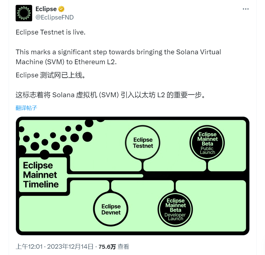 2023 年 12 月 14 日, Eclipse 官方推特发布了推出测试网的公告。
