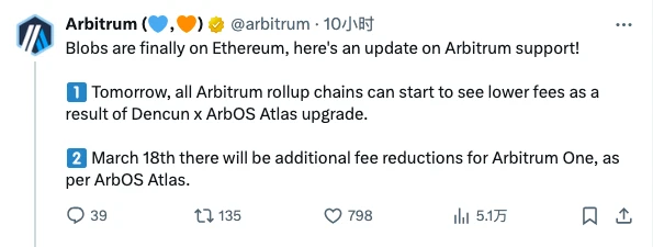 就当前来看,Arbitrum 暂时仍是 gas 费用降低幅度最小的 Layer 2 网络,但鉴于该团队已表态会在 3 月 18 日的 ArbOS Atlas 升级后进一步降低费用,所以希望用户继续保持耐心。