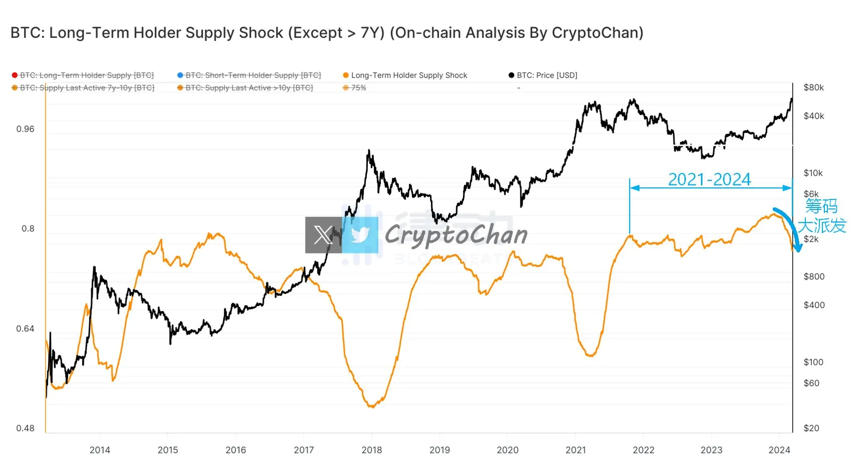 据链上分析师 @0x CryptoChan,比特币价格在持续走高之际,链上持币大于 155 天的 BTC 持有者持币总量占 BTC 总流通量百分比却在下降,这意味着流动性在向比特币之外的方向转移。