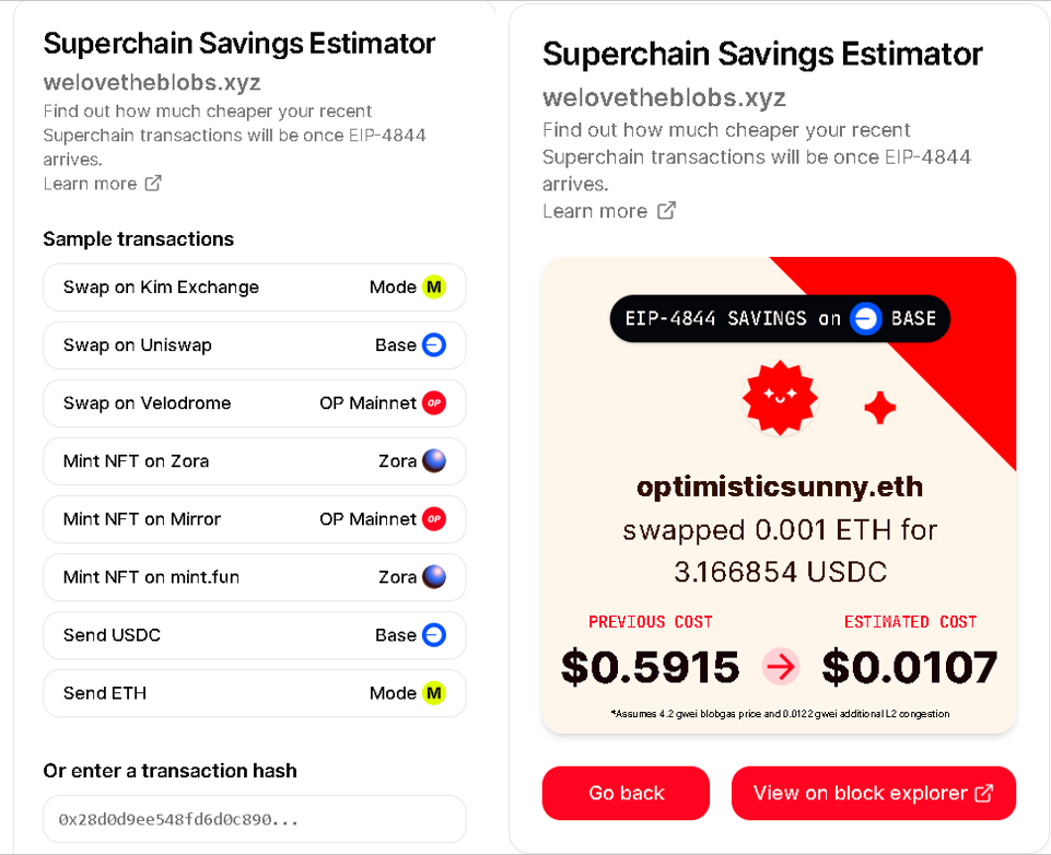 以太坊核心开发者 eric.eth 曾表示,EIP-4844 的落地将导致以太坊系 L2 交易的 gas 成本将会降至 0.01 美元左右。据 Optimism 推出的 网站 ,在 Uniswap 上执行一笔 swap 的交易成本将从实时的 0.59 美元降低至 0.01 美元。