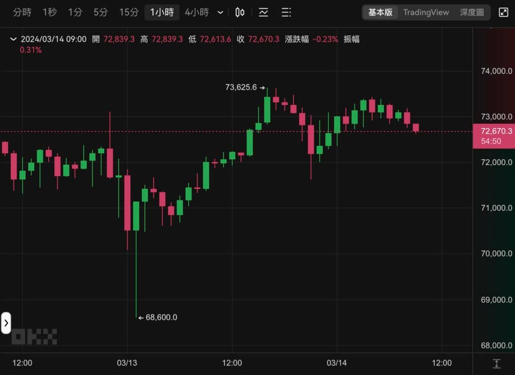 回到比特币价格,自从昨(13)日下午最高触及 73,625 美元之后,BTC 曾短暂跌破 7.2 万,但很快又反转拉回。截稿前现报 72,670 美元,近 24 小时上涨 1.82%。