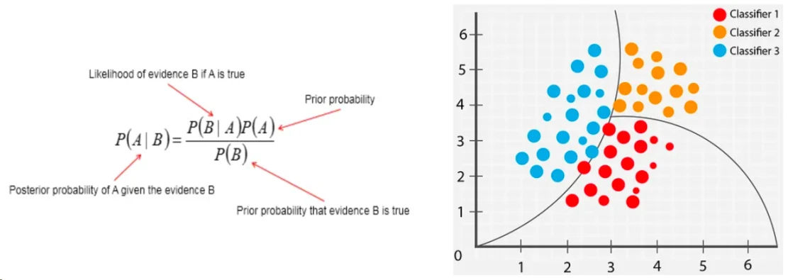 如图 2 所示,在有监督的机器学习中,就是利用数据和基于贝叶斯定理的概率模型来进行分类决策。利用似然度和类别以及特征的先验概率,贝叶斯分类器通过计算数据点属于各个类别的后验概率,并将数据点分配到后验概率最大的类别中去。在右侧散点图中,分类器将尝试找到一条曲线,最好地将不同颜色的点分开,从而最小化分类错误。