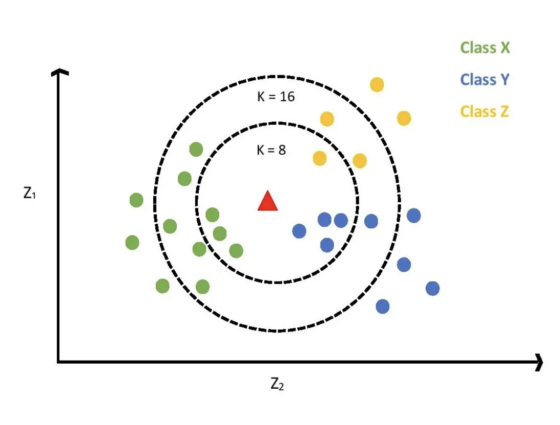如图 5 所示,KNN 算法在分类中的工作原理是找到一个新数据点的最近的 K 个邻居,然后根据这些邻居的类别来预测新数据点的类别。如果 K= 1 ,那么新的数据点就被简单地分配到它最近的邻居的类别。如果 K>1 ,那么通常会用投票法来确定新的数据点的类别,也就是说,新的数据点会被分配到最多邻居属于的类别。而当 KNN 算法用于回归问题时,其基本思想是一样的,而结果是最近邻的 K 个样本输出值的平均值。