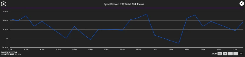 同时,比特币 ETF 相关的数据已经实现了数个新高: 贝莱德现货比特币 ETF(IBIT)持仓量达到 223, 645.98255 BTC(超过比特币 2100 万枚理论最大供应量的 1% ),市值超过 160 亿美元,创下新高;美国当地时间时间 3 月 12 日比特币现货 ETF 总净流入 10.5 亿美元,创下 ETF 首个交易日以来的单日净流入历史新高,相较于次高点(2 月 28 日单日净流入 6.73 亿美元)增加约 56% ;比特币 ETF(包括现货和期货 ETF)总市值为 601.43 亿美元,总资产管理规模(AUM)为 553.74 亿美元。