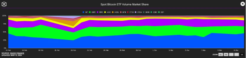 从市场占比来说,也很符合我们从成交量里看到的比例:从二月中开始有一段明显的下滑,其中 VanEck 的 HODL 占比逐渐上升;但自那之后,就恢复了 IBIT 第一,GBTC 第二,FBTC 第三的位置,Ark 等小玩家紧随其后,且在牛市之后,贝莱德的 IBIT 占比还出现了大幅提升, 从此前的 33% 左右跃升至如今的 45% 左右。