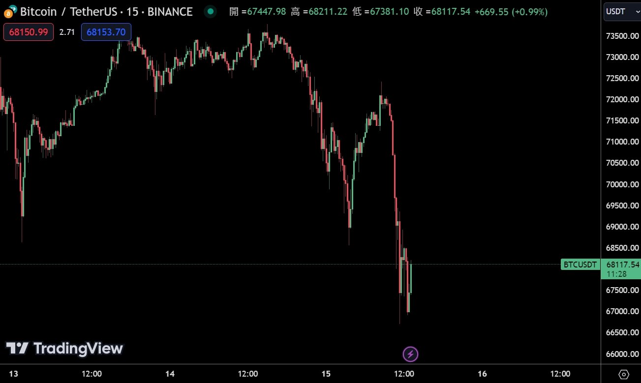 比 特币(BTC)在今早 9 点 45 分起突然大跌,一路从 7.18 万美元附近,在一个半小时内,迅速崩跌至 66699 美元低点,最大跌幅超过 7%,至截稿前,报 68117 美元。