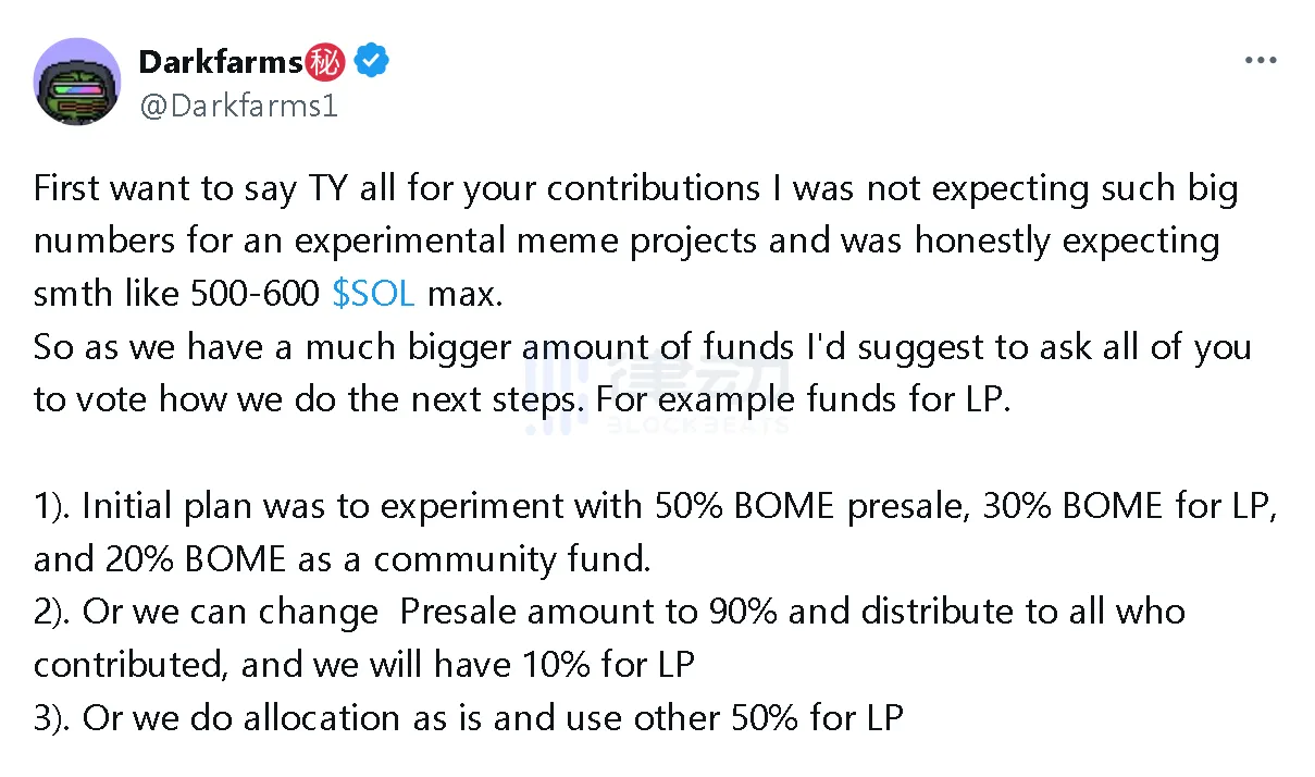 3 月 13 日,Darkfarms 开启了预售,通过向指定的 Solana 地址发送 SOL 即可参与,该预售没有固定的价格,所有参与预售的人根据其捐赠的 SOL 比例分配代币。对于 meme 来说,预售启动属实是一种别具一格的玩法。
