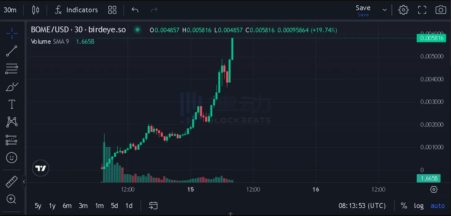3 月 15 日,据 birdeye 数据显示,BOME 上涨突破 0.005 美元,续创历史新高。截至撰稿时,BOME 价格涨至 0.005816 美元, 24 小时交易量达 3.6758 亿美元。