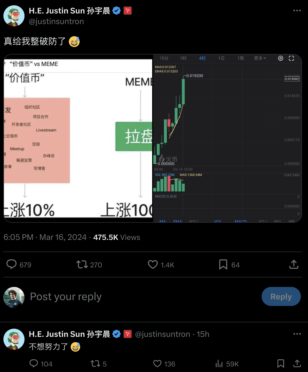 另一方面,看到 Solana 生态迷因币 $ BOME 在短短三天内接连暴涨下,孙哥也在 X 平台分享自己的看法,他秀出「价值币」与「迷因币」的比较图,相较于迷因币,价值币需要𫔭发、项目合作、躲避监管……等各种努力,才能让价格有些微上涨,然而,在迷因币仅仅需要「拉盘」。