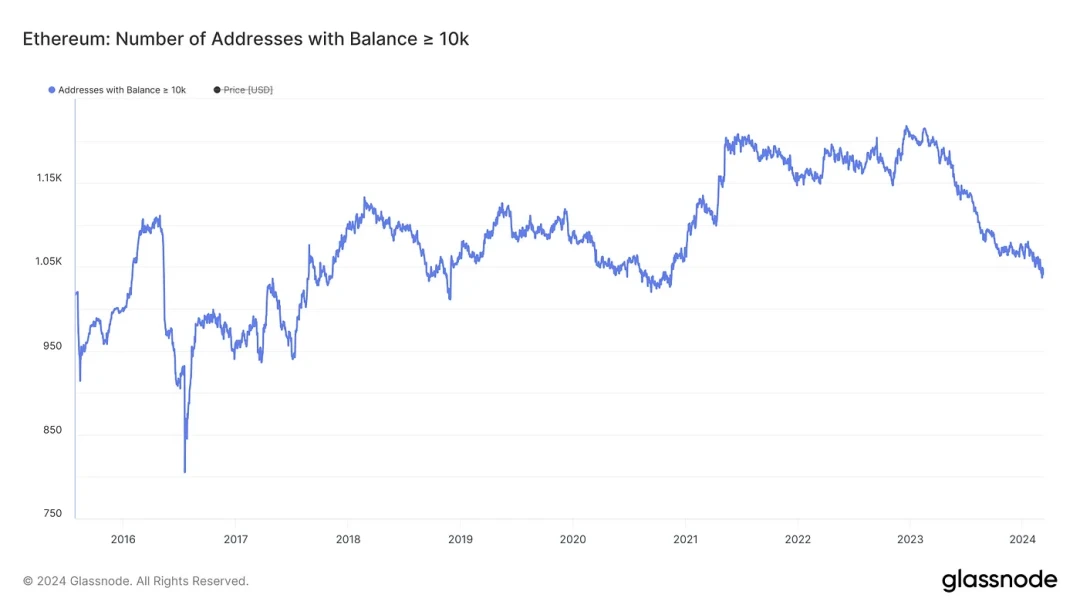 如果只考虑余额超过 1000 ETH 的地址,也可以得出同样的结论。鲸鱼似乎正在利用投机和乐观情绪出售 ETH 来获利。