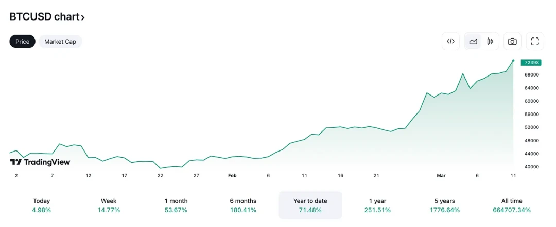 毫无疑问,现货 ETF 的获批将为 BTC 和 ETH 的价格表现提供充足的支撑。现货 ETF 获批后,美国股市额外的流动性支持推动 BTC 价格从年初至今上涨超过 71% ,BTC 价格一度突破 7.2 万美元,创历史新高。
