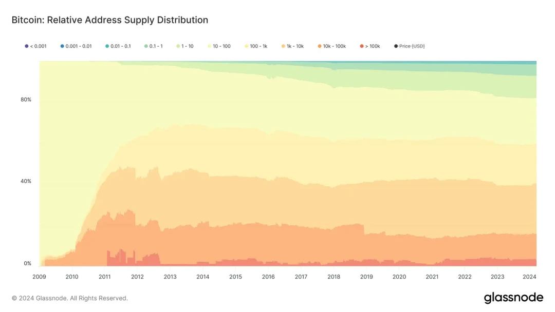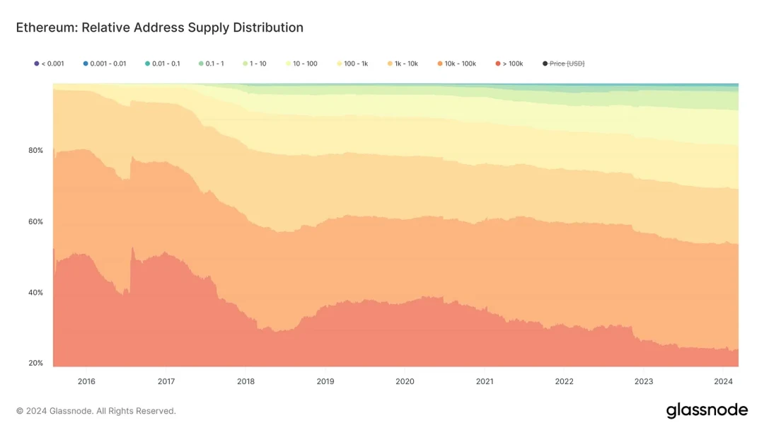 相比之下,BTC 持有者没有投票权,不会对 BTC 网络的运行产生重大影响。自 2009 年以来,BTC 持有者的分布变得相当自然和均匀:截至 2024 年 3 月,持有 1000 枚以上 BTC 的鲸鱼仅拥有 BTC 供应量的 40% 左右,而鲸鱼地址数量也达到 2100 个,这使得 BTC 价格操纵的可能性明显低于 ETH。