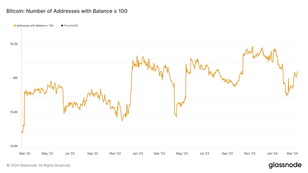 从链上数据的角度看,尽管矿工的季度抛售行为对统计数据产生了一定影响,但自 2023 年 5 月以来,持有余额超过 100 BTC 的地址数量呈现显著上升趋势。与 2022 年第一季度和 2023 年上半年相比,矿工抛售行为对地址数量的影响明显减弱,这意味着许多现货鲸鱼在此期间买入了大量 BTC,现货 BTC ETF 随后获得批准。