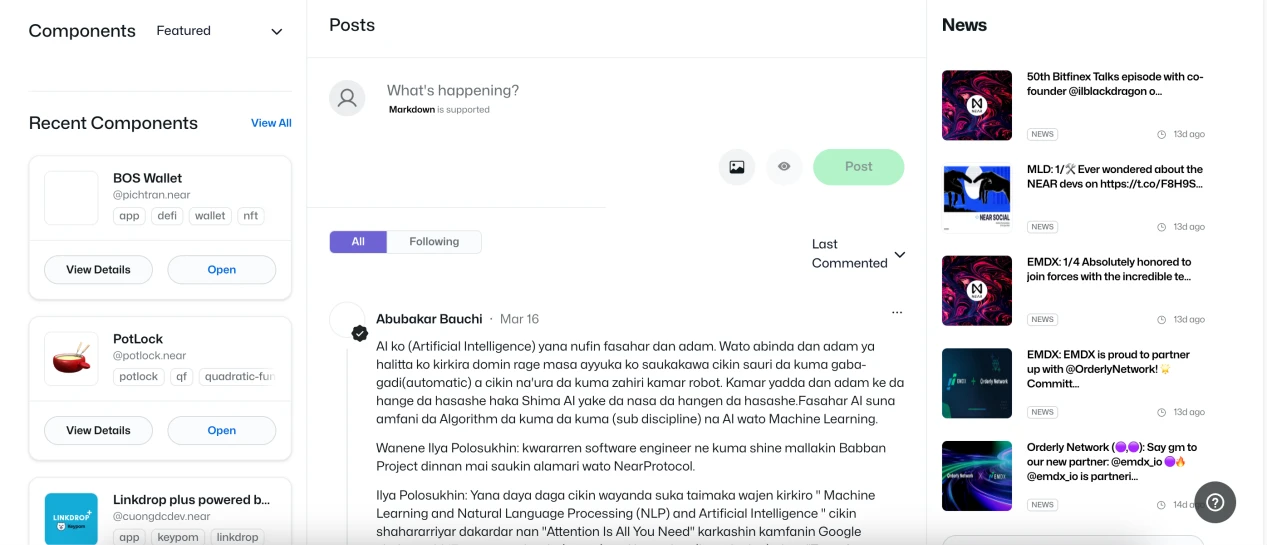 在前端界面,NEAR Protocol 推出了全新区块链操作系统 BOS,旨在成为 Google、Apple、Amazon、Facebook 和 Microsoft 的开源替代品,是一个安全、透明、可访问的碳中和平台,消除了 Web3 空间的复杂性,当前打开登陆 NEAR 的网站,可以看到类似Web2门户网站般的界面,并可以统一一个账户启动多种类型的 DAPP.