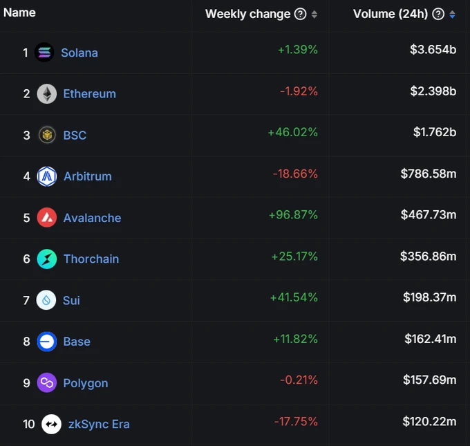 同日,Solana 全网 DEX 交易总额达到创纪录的 38.08 亿美元,这一数据超过了当日以太坊及其所有 Layer 2 的 DEX 交易总额。