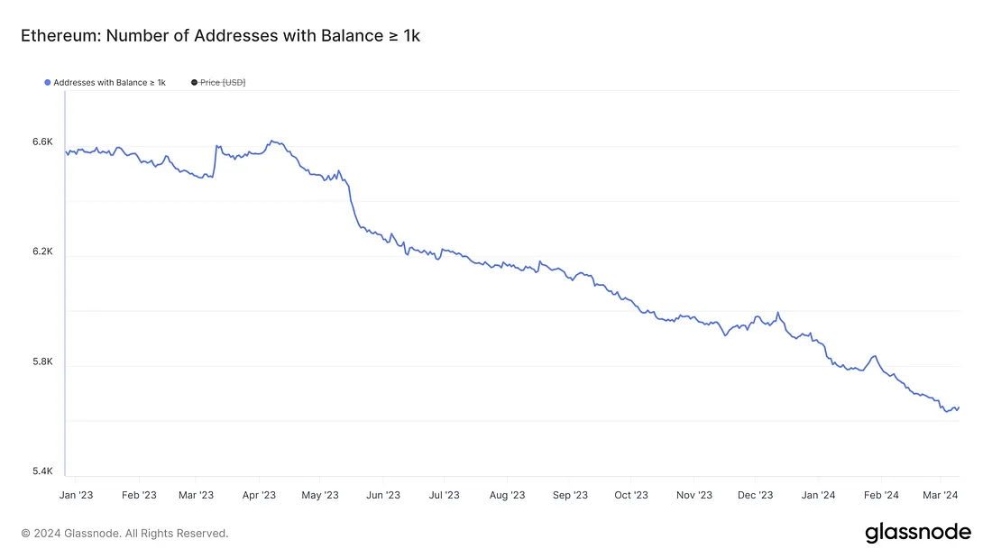 如果我们只考虑持有超过 1000 枚 ETH 的地址,也可以得出同样的结论,巨鲸似乎正在利用投机和乐观情绪出售他们的 ETH 以获取利润。