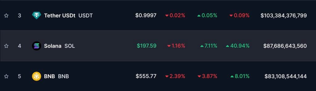 SOL 的强劲上涨,也让其市值超越币安的 BNB,正式成为加密市场第四大代币。