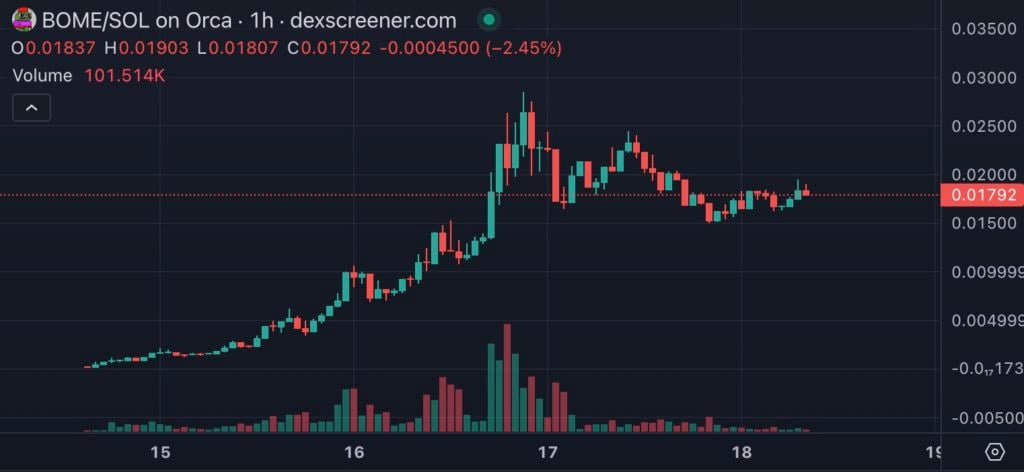 不过根据 DexScreener 数据,BOME 在突破 0.028 美元后持续震盪下跌,撰稿当下报 0.01792 美元,近 24 小时下跌近 20%。动区提醒该代币波动剧烈,投资前请小心谨慎。