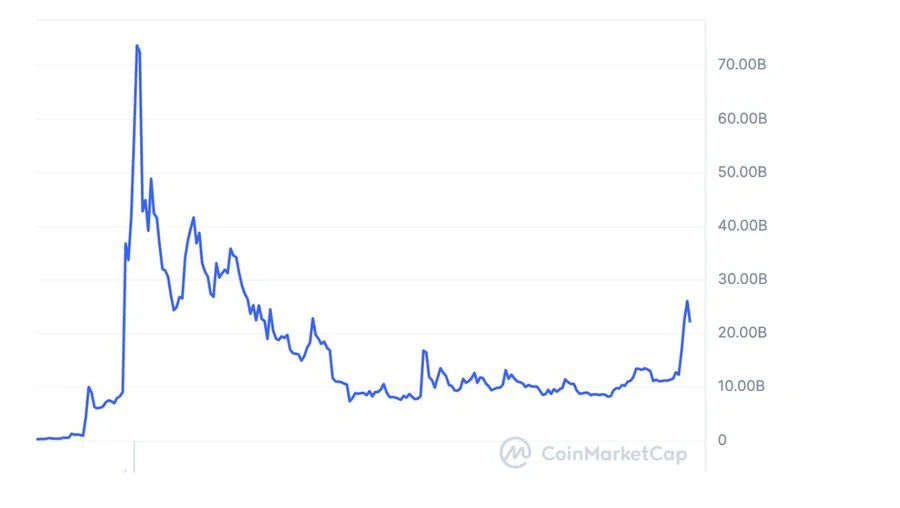 无论 meme 币是否具有内在价值,上述论点都是成立的,但认为 meme 币从根本上毫无价值的假设却越来越站不住脚。一个直观的指标就是市场价格。例如,Dogecoin 在 22 年熊市的最低市值为 77 亿美元。
