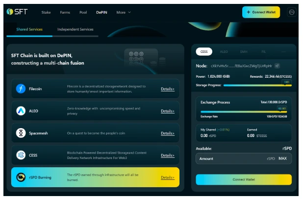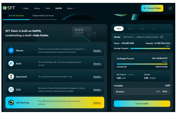 SFT Chain 是一个多链融合平台,桥接物理基础设施与Web3的应用链,致力于建设聚合存储、计算和 CDN 等领域的 DePIN 平台。作为去中心化基础设施网络的领跑者,SFT Chain 致力于搭建一个开放、包容的平台,与多个公链进行整合和合作,为用户提供更加灵活和多样化的服务选择。目前,SFT Chain 已与 TP 钱包、新火科技、Filecoin、Filfox wallet、CESS 等达成战略合作,并上线了 Filecoin、Cess、Spacemesh 等基础设施,共同推动去中心化物理基础设施网络(DePIN)的发展。这个战略合作标志着在构建全面的 DePIN 平台上迈出了重要的一步,开启了区块链驱动的去中心化存储和 CDN 网络新纪元。