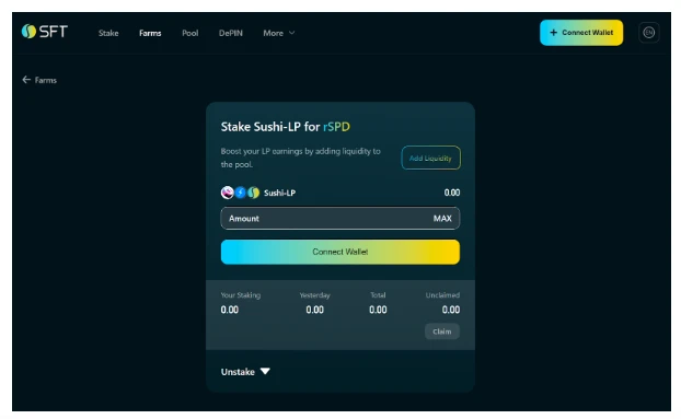Sushi-LP 流动性池是 SFT Chain 为用户提供了将数字资产提供给流动性池并获得奖励的机会,这将增加 rSPD 的流动性、价值发现和去中心化程度。