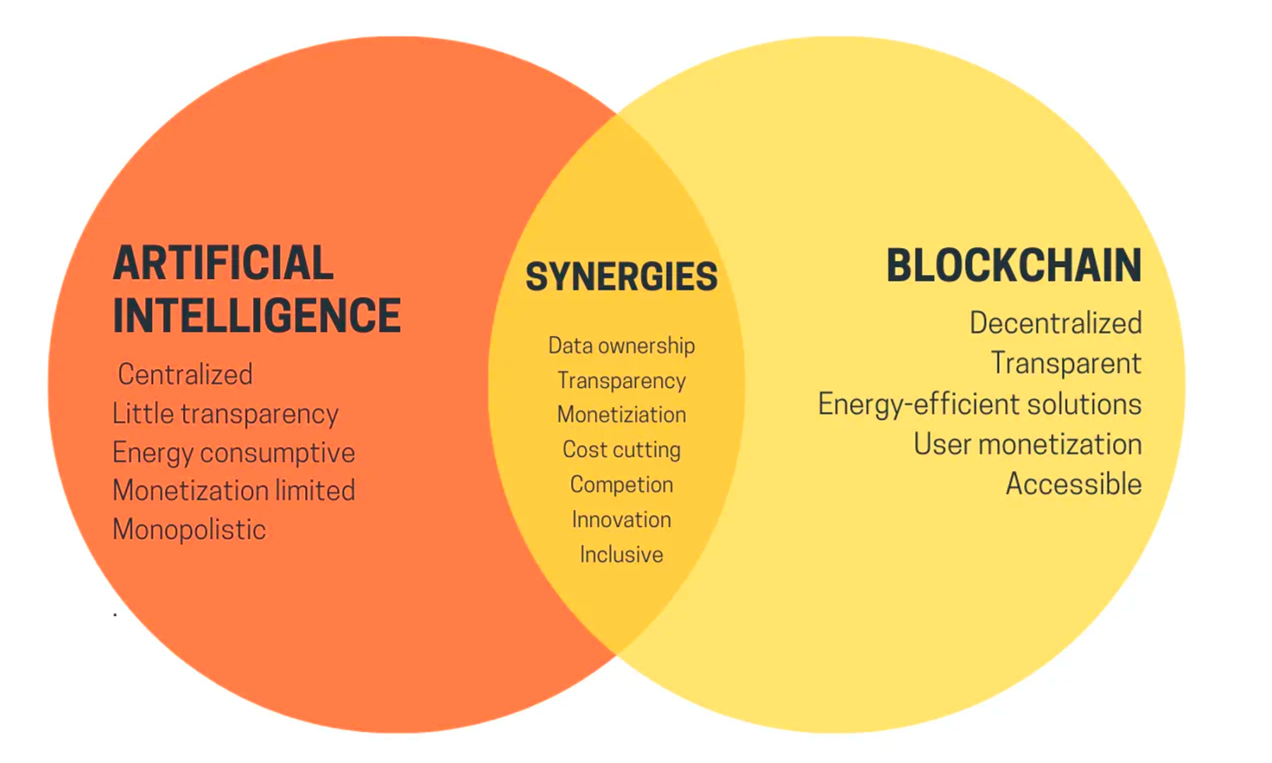 在 DE UNIVERSITY OF ETHEREUM 的 When Giants Collide: Exploring the Convergence of Crypto x AI 一文中,阐述了人工智能和区块链在核心特质上的差异。如上图所示,人工智能的特点是: