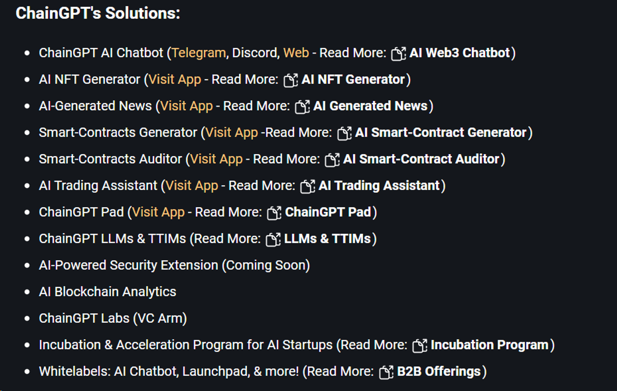 ChainGPT:ChainGPT 依靠人工智能开发了一系列 crypto 工具,如 chatbot、NFT 生成器、新闻集合、智能合约生成与审计、交易助手、Prompt 市场和 AI 跨链交换。但 ChainGPT 目前的发力方向在于项目孵化和 Launchpad,目前已完成 24 个项目的 IDO 和 4 个 Free Giveaways。