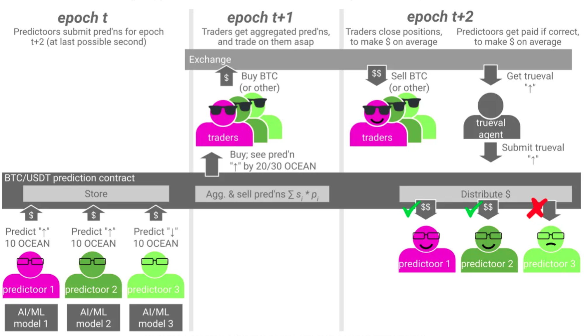 Ocean Protocol:Ocean Predictoor 正在关注预测,开始于加密货币走势的众包预测。玩家可以选择运行 Predictoor bot 或 Trader bot,Predictoor bot 使用 AI 模型对下一个时间点(比如五分钟后)的加密货币(如 BTC/USDT)价格进行预测,并质押一定数量的$OCEAN,协议将根据质押量加权计算出全局预测,Traders 购买预测结果并可以根据其进行交易,在预测结果准确率较高时,Traders 可以从中获利,预测错误的 Predictoor 将会被罚没,而预测正确的则可以获得这部分代币和 Traders 的购买费用作为奖励。3 月 2 日,Ocean Predictoor 在媒体上公布了最新方向——World-World Model(WWM),开始探索对天气、能源等现实世界的预测。