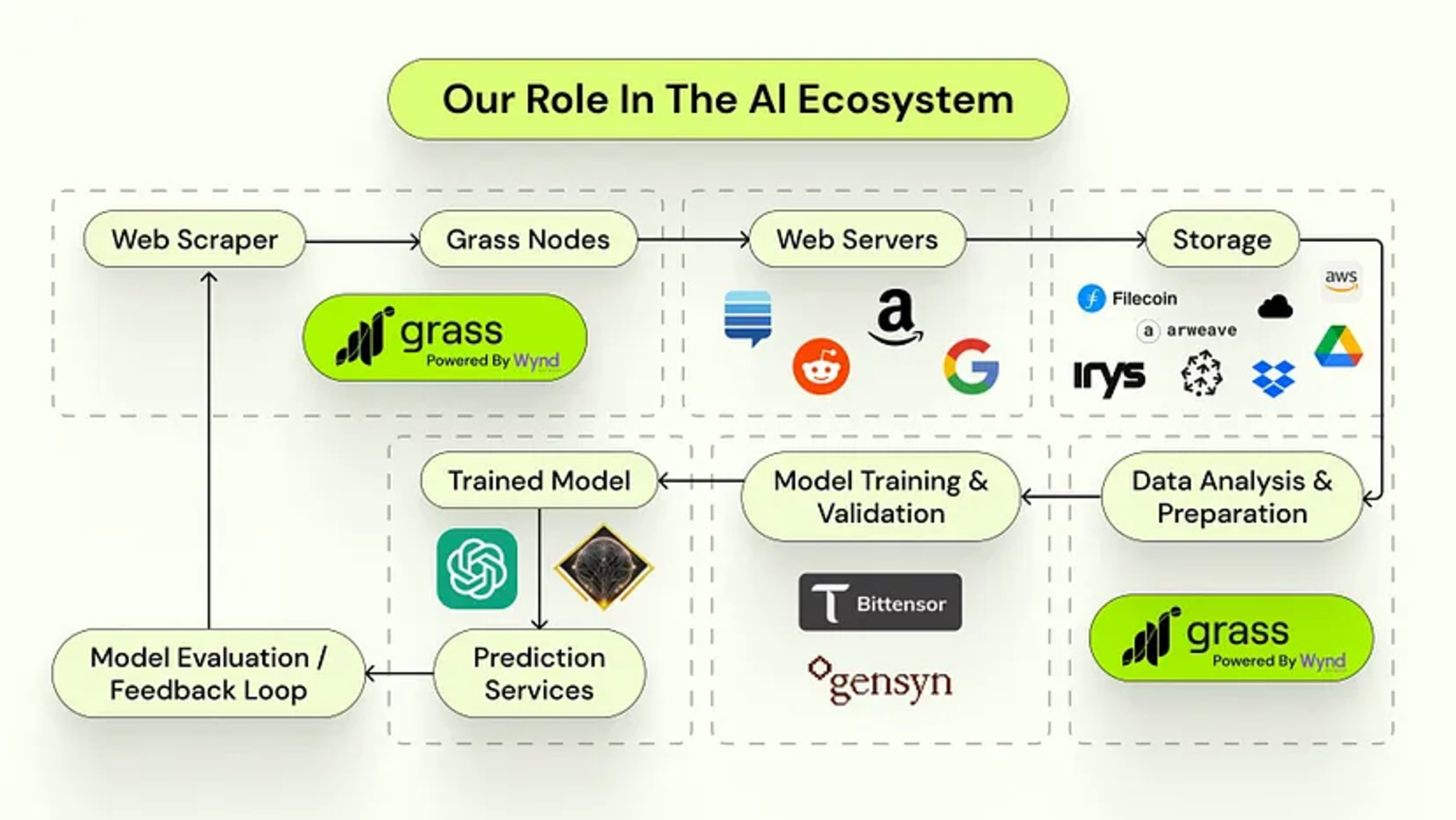 Grass:被称为 AI 的去中心化数据层,本质上是一个去中心化网络抓取市场,并以此获得数据来用于 AI 模型训练。互联网网站是一个重要的 AI 训练数据来源,包括推特、谷歌、Reddit 在内的许多网站的数据都具有重要价值,但这些网站正在不断对数据爬取加以限制。Grass 利用个人网络中未使用的带宽,通过使用不同的 IP 地址来减少数据封锁带来的影响,来抓取公共网站中的数据,完成数据初步清理,成为 AI 模型训练企业和项目的数据源。目前 Grass 正处于 Beta 测试阶段,用户可提供带宽获取积分以领取潜在空投。