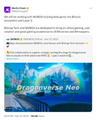 链游龙头 MOBOX ,老牌 OG 团队,币安最早投资的项目之一,通过 Binance Launchpool 上市,至今仍然是交易量最大的游戏项目之一。MOBOX 即将在 Merlin Chain 推出首款共创、共治的 3D 开放世界游戏 Dragonverse Neo ,并构建基于 BTC L2 的游戏 L3。
