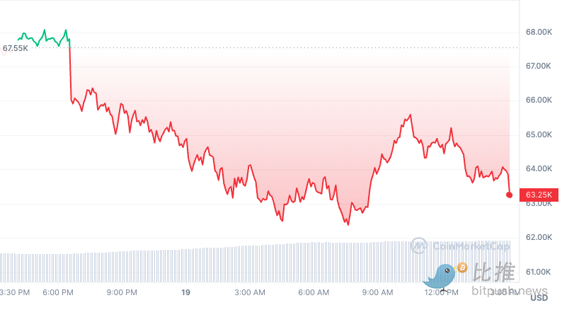 比特币周二延续跌势,一度较上周历史高点下跌超过 1 万美元至 62,320.30 美元盘中低点,比推终端数据显示,截至当天美股收盘,BTC 跌幅收窄,徘徊在 64,000 美元附近,24 小时跌幅约合 5%。