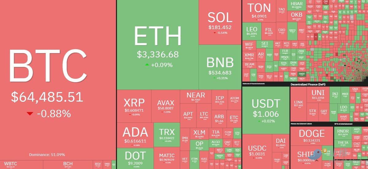 由于比特币的疲软,山寨币市场继续下跌,以太坊下跌超过 4%,收盘时交易价格为 3,335.66 美元, SOL 下跌 8%,狗狗币下跌 5%。周二前 200 名中的大多数代币都出现亏损,仅六种代币则实现了两位数的涨幅。