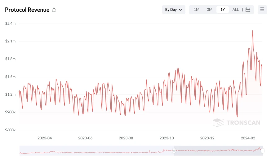 活跃的生态状况正在为 TRX 的质押者们带来丰厚收益, 本月早些时候,波场 TRON 单日协议收入一度达到 16800159 枚 TRX,价值约 2286203 美元,创下历史新高。 此外据 Tronscan 数据,波场 TRON 过去一年协议总收入已高达 4.58 亿美元。