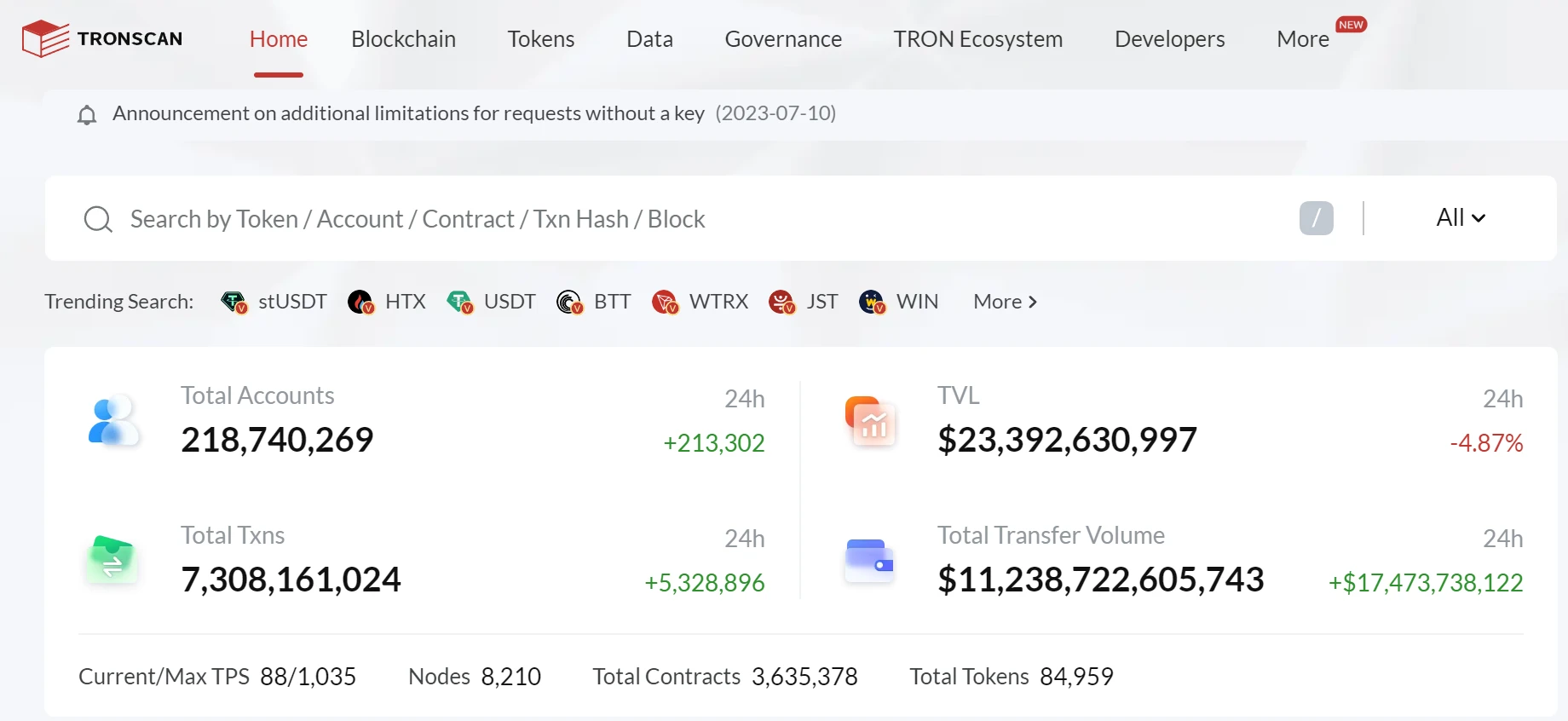 截至 3 月 20 日,Tronscan 提供的部分数据可以直观的展现波场 TRON 网络目前的生态活跃状况: