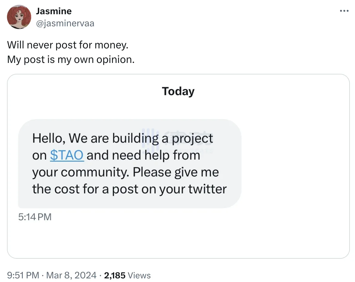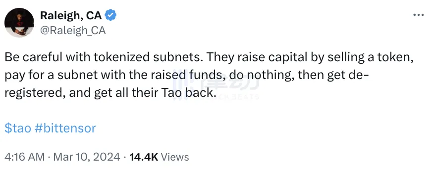 如果都是土狗盘子,那对于投资者来说,定位巨集大、潜力无限的 Bittensor 是不是隻能作为 AI meme 下的龙头专案分支 meme 𧹒入?但又与 meme 不同,在炎热过高时,「别沾 Bittensor」是更稳健的选择。很多人意识到了这一点,「Be careful with tokenized subnets」。