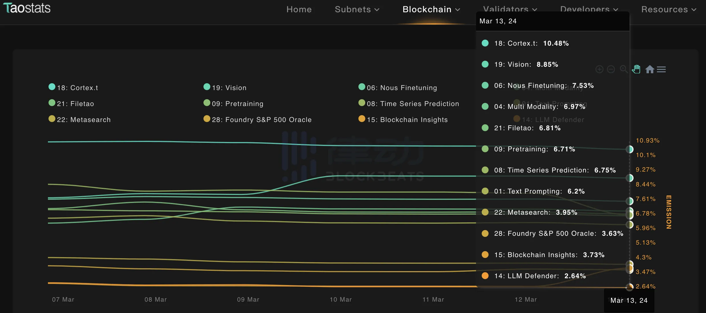 据 taosat 资料现实,截至撰稿时每日排放的 7200 枚 TAO 中,子网 18Cortex. 拥有稳定在 10% 左右的份额,而子网 19 Vision 在近一周的份额从 7.96% 上升至 8.85%,相应的,子网 08 Time Series Prediction 所分配的激励则从 8.49% 下降至 6.75%。