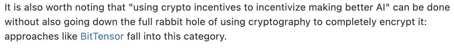 值得肯定的是,Bittensor 确实吸引了许多专注 AI 技术的参与者,子网 18Cortex 来自于𫔭源 AI 研究组织 Nous Research 、子网 9 的效能据称超过了 OpenAI 的 GPT2 大型模型。在利用 Web3 赋能 AI 上,Bittensor 得到了许多肯定。Vitalik 曾在分析 AI 与 Crypto 结合时,用 Bittensor 的案例来解释在不依赖完全使用加密技术的情况下,如何使用加密激励机制来创造更好的人工智慧产品。