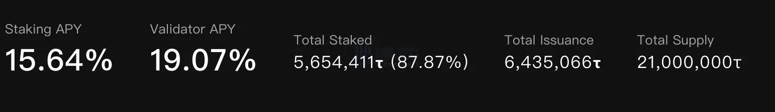 首先,对于 TAO 的未来成长空间,Bittensor「信徒」和社群观望者有著截然不同的认知。一方面,观望者认为其价格近半年攀升 15 倍,市值也到达了 40 亿美元关头,高倍上涨空间有限。但 Bittensor 社群认为,在流通的 TAO 中,有 87% 的代币正在被质押,也就是说真实的代币流通量只占当前市值很小一部分,TAO 的成长空间依然很大。