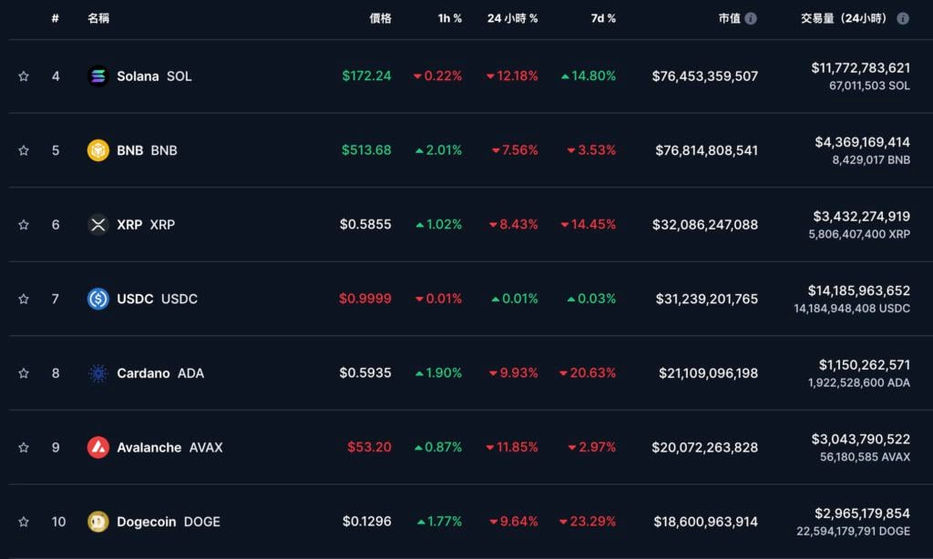 CoinMarkeCap 数据 显示 ,前十大币种近 24 小时普跌,涨幅最大的是 SOL 和 AVAX,分别下挫 12.18% 和 11.58%。