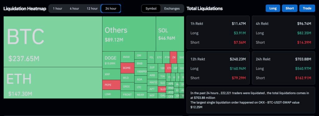 BTC 下杀的行情,再次造成投资者大量亏损。据 Coinglass 数据 显示,过去 24 小时,加密货币全网爆仓金额超过 7 亿美元,有超 22.2 万人遭清算。