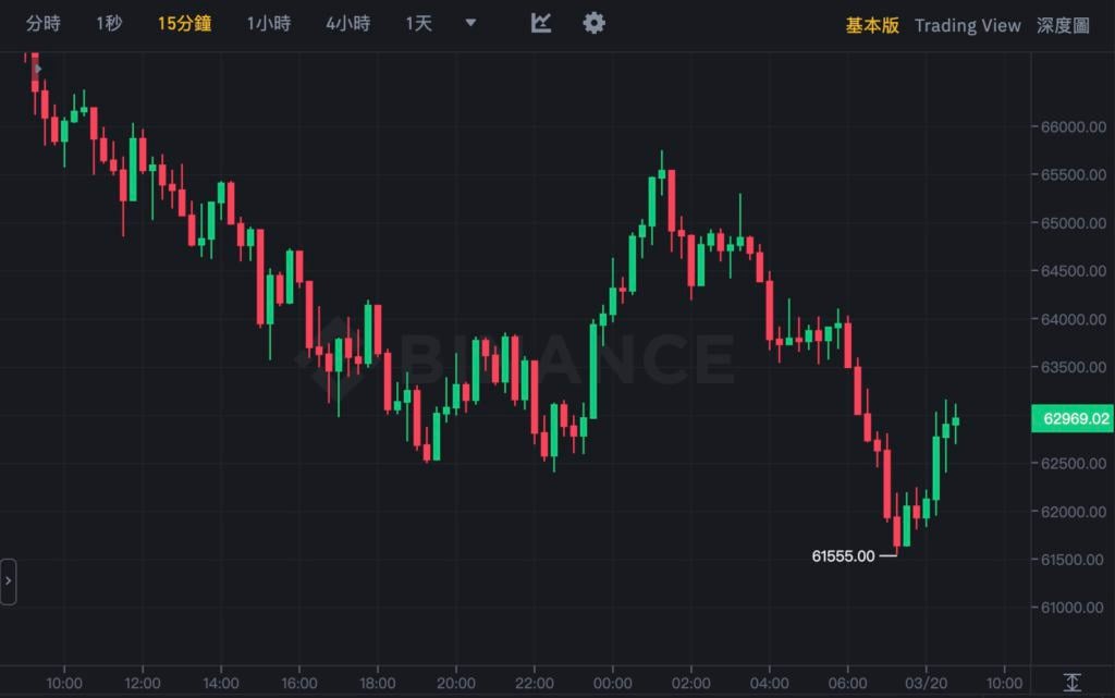 比 特币(BTC)在今(20)日 01:00 最高拉回 65,000 美元之后又𫔭始连续下跌,清晨约七点左右最低更来到 61,550 美元,再次写下两周来新低。