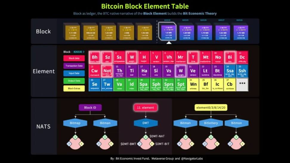值得关注的是,DMT 最初是由一些物理学家提出,他们认为数字信息可以被视为一种类似于实体物质(如木材或金属)的数字物质,预测未来数字信息的使用量有可能会超过原子。就像现实世界由元素构成,元素周期表为寻找现实世界新元素提供了理论依据,科学家利用元素周期表在一定区域内寻找新物质 ( 如半导体材料、催化剂等 ),服务于现实世界建设。区块链技术社区推动了 DMT 在比特生态里被接受和持续发展。