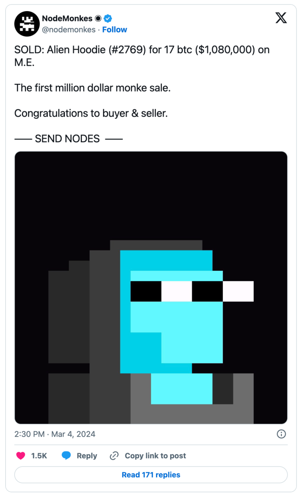 目前 NodeMonkes 和 Runestone 是 Ordinals 协议上最火的两个 NFT 项目,截至 3 月 20 日,所有链上 NFT 市值分别排列第四和第六。