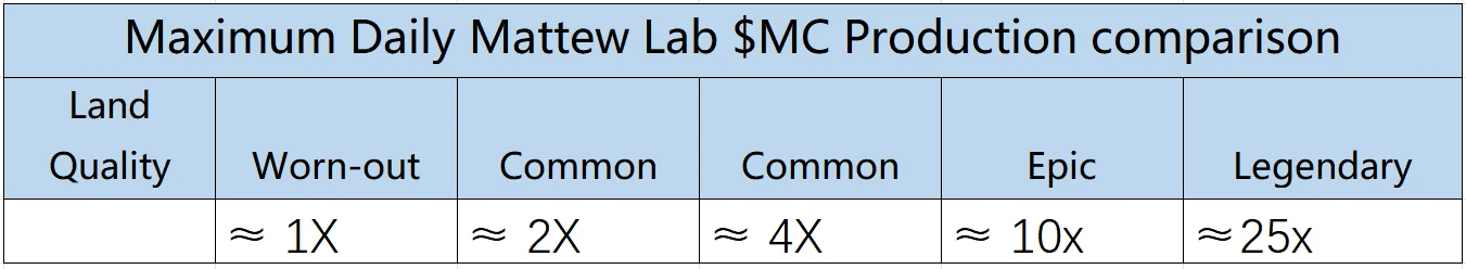 *注意:此比较图表显示了不同品质土地之间“最大” $MC 产量差异的估计,以帮助玩家更好地了解土地品质对回报周期的影响。
