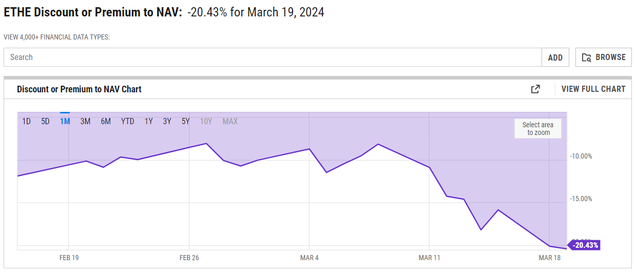 随著市场对以太坊现货 ETH 在 5 月份过关的预期降低,据 ycharts 数据 显示,目前灰度以太坊信讬 ETHE 负溢价已经扩大至 20.43%,创下自 2023 年 11 月以来折价的最高水平。
