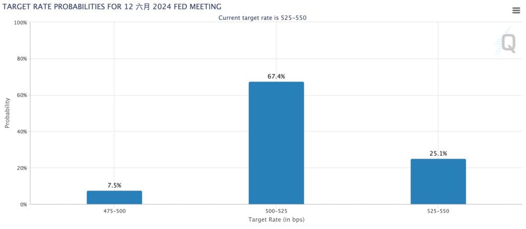 Fedwatch 预测显示 ,今年首次降息发生在 5 月的可能性当前只有 10%、但在 6 月的可能性就上涨接近 67%。